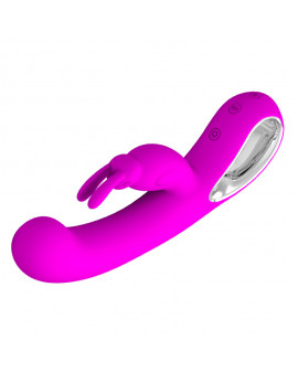 Fioletowy wibrator z akumulatorem ładowanym USB. Ma stymulator łechtaczki w postaci króliczka. Gładka powierzchnia. Materiał - silikon. Posiada 12 trybów wibracji, sterowanie odbywa się za pomocą przycisków dotykowych u podstawy zabawki. Charakterystyka: długość całkowita - 21 cm, długość robocza - 12 cm, maksymalna średnica - 3,5 cm, długość procesu łechtaczki - 7 cm, średnica - 2,5 cm, Działa z USB (w zestawie). Zawiera etui do przechowywania. Opakowanie: karton z nadrukiem.