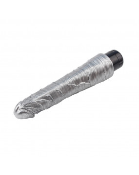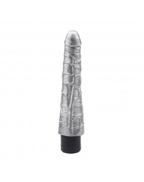 Realistyczny wibrator w kolorze srebrnym. Posiada wyraźną główkę, z wytłoczonymi żyłami dla dodatkowej stymulacji. Przyjemne w dotyku, bez szwów. Regulacja wibracji za pomocą kółka u podstawy. Wyposażony w wibracje o różnej prędkości, zasilany dwiema bateriami AA (nie dołączone).
